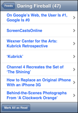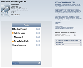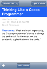 NetNewsWire for iPhone uses the NewsGator Online sync platform, so you can use NetNewsWire on your Mac, FeedDemon on Windows, NewsGator Online on the web, or any of our other applications, and they will all sync together. I’ve talked about this a lot in the past…but this is really the only reasonable way to build a mobile reader, IMHO. We use mobile devices as companion devices, in addition to our desktop and/or laptop computers - they’re not the only devices we use.