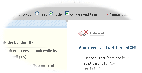First, it works with the NGOS synchronization system (more info). So you can read posts at home with Web Edition, and when you get to the office and download posts with NewsGator for Outlook, you won’t have to read the same content. Unless you want to. And remember the sync system works with POP Edition and Mobile Edition too - more to come on that. Combine that with an online subscription management system, which even allows you to expose a subset of your subscriptions publicly as OPML, and we’re onto something here.