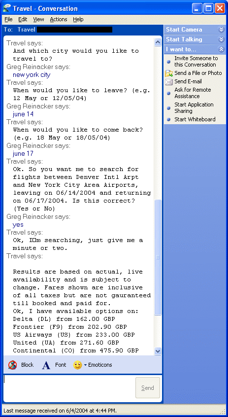 As some of you know, I used to do development consulting in the travel business. Well today, I was fortunate enough to get a glimse of a new application from TravelMessenger, the likes of which I haven’t seen before. It’s basically an automated travel agent, which you interact with via MSN Messenger: