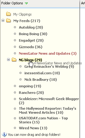 NewsGator Online provides a hierarchical folder stucture for you to organize your feeds, and it provides a “organize folders” function so you can arrange them how you wish. This worked, and we actually had a lot of customers praise this “organize folders” page versus what some other tools are doing.